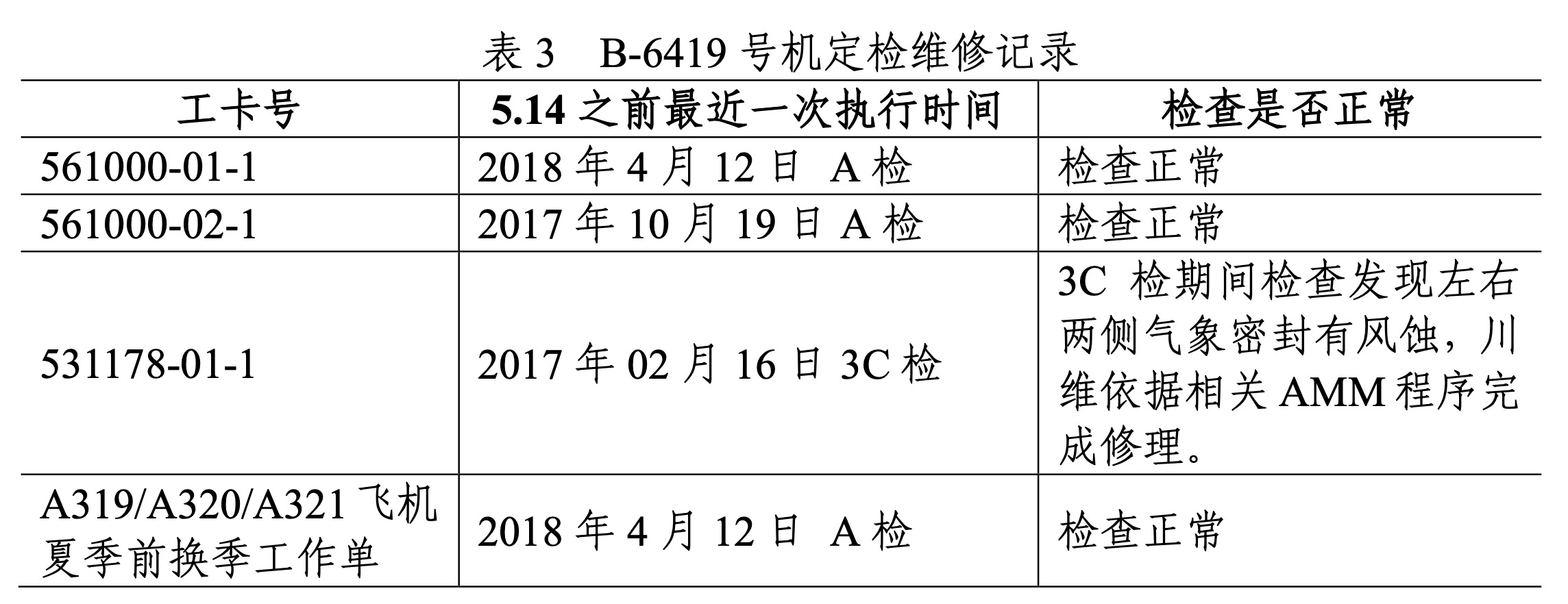 在航空器放行情況方面,報告顯示,3U8633航班為B-6419號機當日首發航班,維修人員依據航前工作單完成航前檢查,結果正常(最近一次航后與航前,機組未反映任何故障或異常情況),且無缺陷記錄和故障保留。截至5月14日事故當天,該機持續按照有效《維修方案》實施維修工作,最近一次定檢為4A5,于2018年4月12日由川航自主完成,結果正常。根據B-6419飛機工程管理與維修工作記錄,確認該機事發前處于適航狀態。