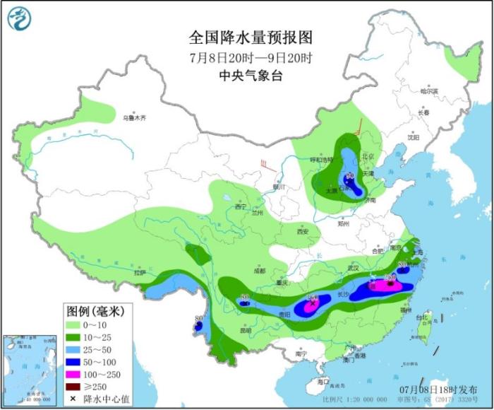 據(jù)預(yù)計(jì),7月8日20時(shí)至9日20時(shí),江西中北部、福建北部、浙江中南部、上海、湖南中部、貴州中南部、廣西北部、云南西部和東北部、四川南部以及華北中西部等地有大到暴雨。