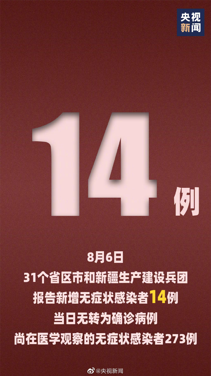31個?。ㄗ灾螀^、直轄市)和新疆生產建設兵團報告新增無癥狀感染者14例(境外輸入4例);當日無轉為確診病例;當日解除醫學觀察23例(境外輸入9例);尚在醫學觀察無癥狀感染者273例(境外輸入112例)。