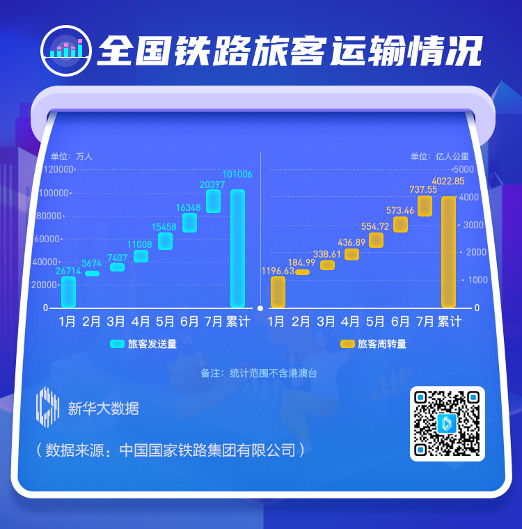 火車作為主要出行交通工具之一,極大地方便了人們的日常生活。恰逢今年國(guó)慶節(jié)與中秋節(jié)重合,足足8天的假期,預(yù)計(jì)鐵路客流量將有明顯增長(zhǎng)。據(jù)中國(guó)鐵路總公司發(fā)布的數(shù)據(jù),今年5月開始,旅客發(fā)送量呈大幅增長(zhǎng)態(tài)勢(shì),到7月末,全國(guó)鐵路累計(jì)發(fā)送旅客101006萬人。除此之外,旅客周轉(zhuǎn)量也在逐漸增加,截至7月,全國(guó)旅客中轉(zhuǎn)量累計(jì)4022.85億人公里。