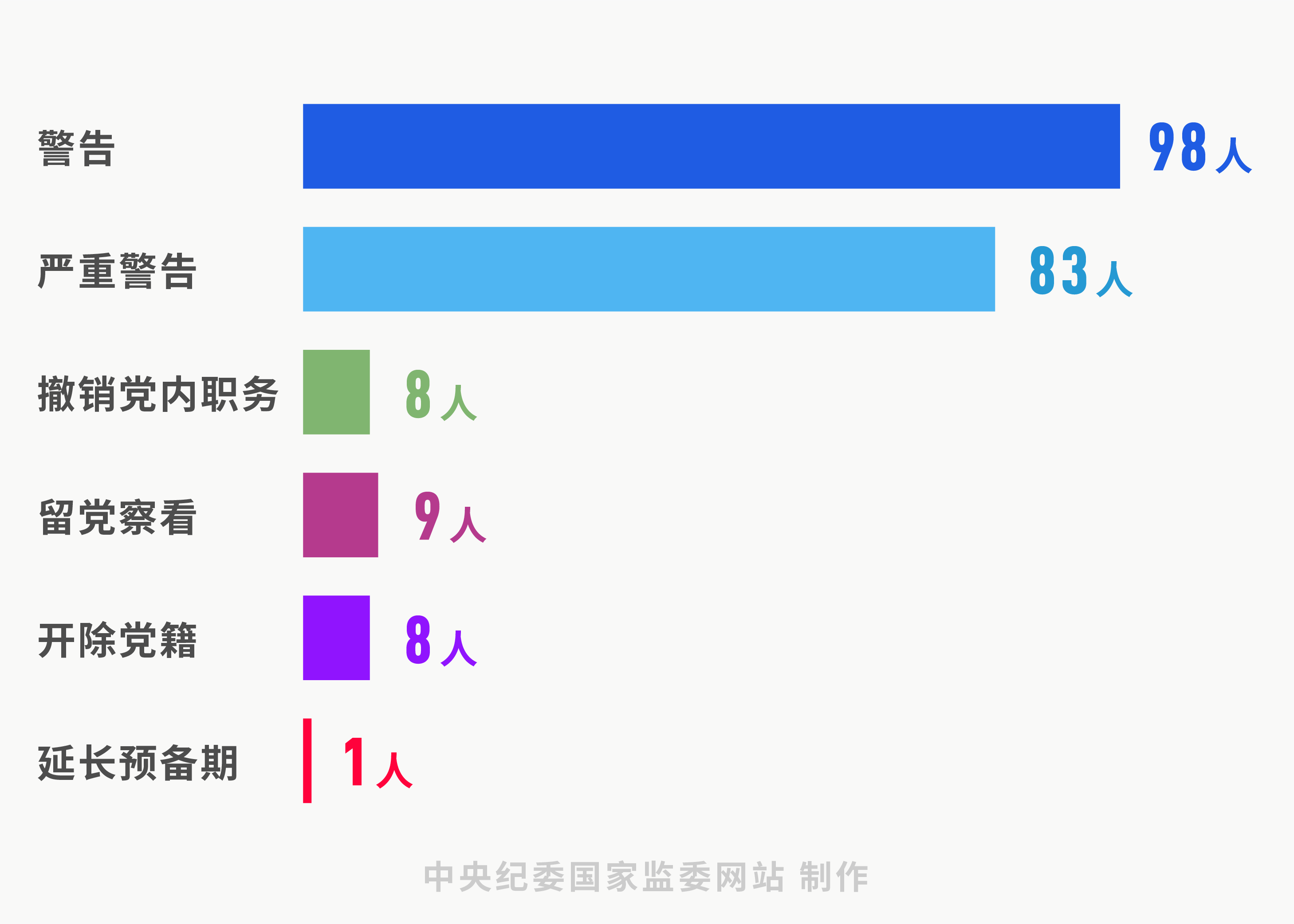分析處分類型,受到黨紀處分的共計207人,其中,警告98人,嚴重警告83人,撤銷黨內職務8人,留黨察看9人,開除黨籍8人,延長預備期1人;受到政務處分的共計42人,其中33人同時受到黨紀處分;12人受到誡勉談話、談話提醒、調離崗位等處理。運用第一、二種形態處理人數,占處理總人數的92%。用足用好“四種形態”,咬耳扯袖、紅臉出汗已成常態,監督執紀更加精準,使更多干部受到警醒,體現的是嚴管和厚愛結合。