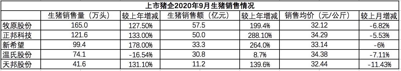9月銷售情況方面,牧原股份、正邦科技、新希望和天邦股份生豬銷量增幅均超過100%,銷售收入也相應(yīng)翻倍增長(zhǎng)。其中,牧原股份仍以165萬頭的銷量位居行業(yè)首位,較上年增長(zhǎng)127.5%,銷售額為57.5億元,較上年增長(zhǎng)199.4%。與之形成對(duì)比的是,溫氏股份9月生豬銷量已下滑至上市豬企第四位,出欄量為74.1萬頭,較上年減少16.54%,銷售額為30.8億元,增長(zhǎng)8.7%。