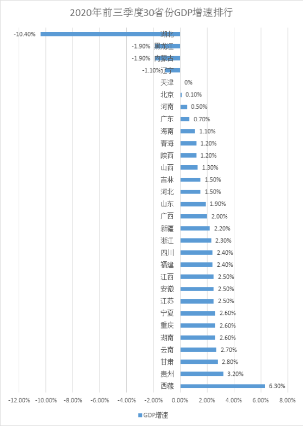 從前三季度經濟增速上看,30省份中,25省份已實現正增長,其中23省份超越或持平于全國線(0.7%)。遼寧、內蒙古、黑龍江、湖北負增長,天津增速為0%。
