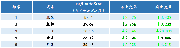 從環比跌幅TOP5城市來看,10月份租金跌幅前5城市分別是北京、成都、三亞、大連、天津。北京受到疫情反復的影響,加上現階段進入行業淡季,市場活躍度呈現持續下降趨勢。三亞隨著邁入旅游淡季,租賃需求減弱,租金水平明顯下滑。