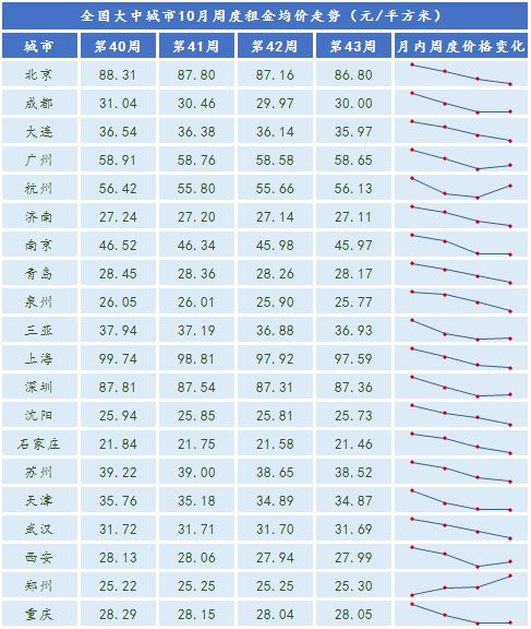 報告稱,10月,全國大中城市租金掛牌均價為42.65元/平方米/月,環比下降1.3%,同比下降2.48%,環比降幅較上月擴大1.25個百分點。各等級城市租金水平均呈現下滑態勢,行業淡季之下市場活躍度顯著下降。