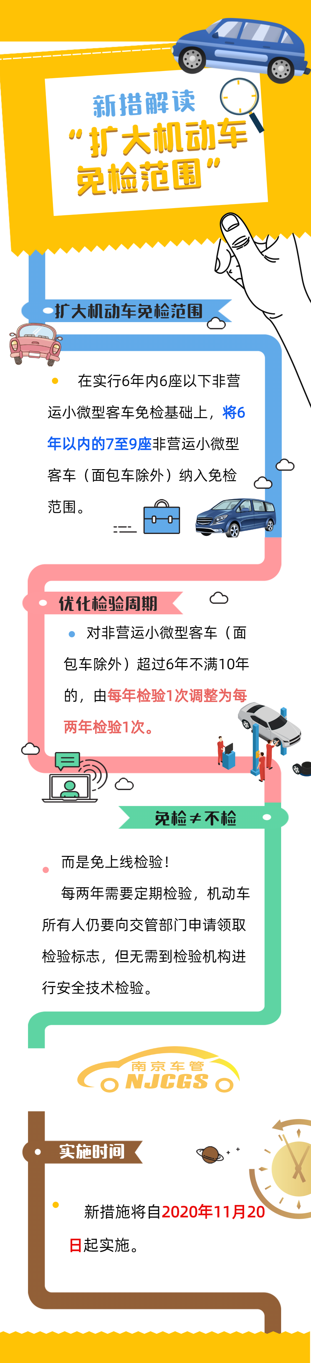 12項(xiàng)“放管服”改革優(yōu)化營商環(huán)境新舉措將在11月20日生效。其中,關(guān)于“擴(kuò)大機(jī)動(dòng)車免檢范圍”的新措施備受大家關(guān)注。不少車主也提出了疑問,我的車到底在不在免檢范圍內(nèi)?新政中“免檢”意思是不用檢驗(yàn)了?我的車能享受到新措施“福利”嗎?......南京車管所為此專門制作了小微型客車檢驗(yàn)周期表,車主們速收藏!