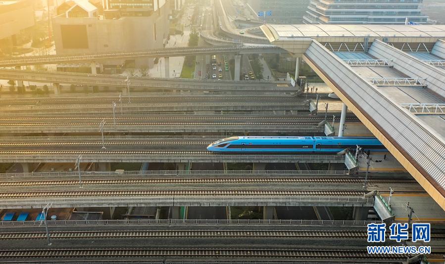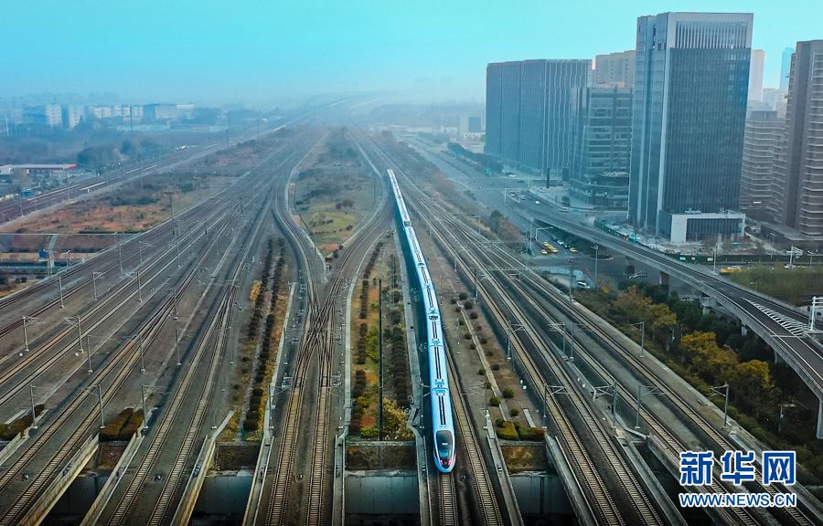 12月24日,由CR300BF型“復興號”動車組擔當的C3887次列車駛出南京南站(無人機照片)。新華社發