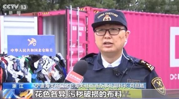 寧波海關(guān)所屬北侖海關(guān)駐臨港辦事處監(jiān)管科副科長(zhǎng) 何旦皓:許多花色各異、污穢破損的布料,且散發(fā)出一股異味。