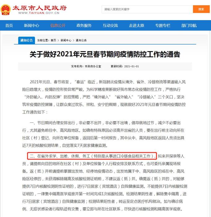 如山西太原市要求,在省外求學、出差、休假、務(wù)工(特別是從事進口冷鏈食品相關(guān)工作)、擬來并探親等人員,請?zhí)崆跋蚰康牡厮谏鐓^(qū)(村)及單位報備個人行程安排及聯(lián)系方式。