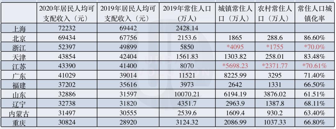 前面我們提到,北京與上海的差距從上年的1686元擴大到了2798元,事實上,京滬城鎮居民人均可支配收入在2019年同步跨過7萬元高線,北京還以234元的微弱優勢領先于上海,但總排名上,上海為什么能力壓北京?除了城鎮居民收入上升外,農村居民收入也貢獻不小。此外,還有一個特征值得注意。人均可支配收入排名靠前的省份,常住人口城鎮化率普遍較高,跑贏了全國平均線(2019年為60.60%)。