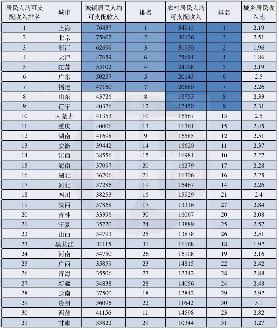農村居民消費人均消費支出前十分別是:上海、浙江、北京、廣東、江蘇、天津、福建、安徽、湖南和四川。