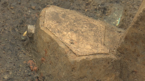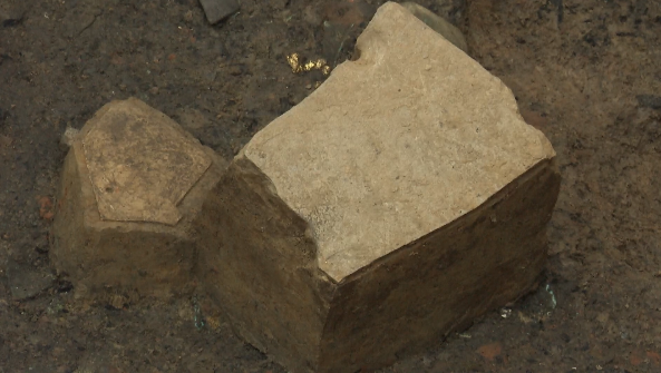 北京大學考古文博學院博士 8號坑負責人 蔡寧:紅燒土塊可能是和建筑的墻體有關,木料我們推測可能是建筑的梁或者是柱一類的東西,石板我們覺得可能是和墻體有關,這樣的話,這三類東西都給我們指向一個關于建筑的線索。