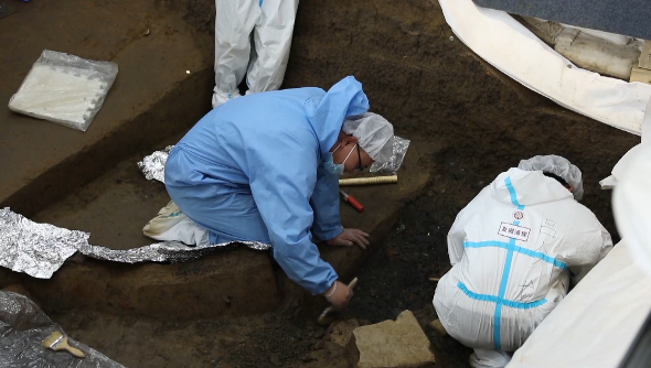 北京大學考古文博學院博士 8號坑負責人 蔡寧:一塊一塊地清理,最后全部揭露出來之后,我們整個地再進行三維掃描,然后再進行繪圖,把這個遺物的分布狀況完全搞清楚之后,我們再整體地提取。