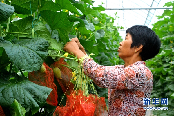 ??? 位于楊邊村的石壁鎮現代農業觀光園擁有哈密瓜、葡萄、草莓等種植示范區500畝,游客可在此處體驗采摘的樂趣。圖為果農養護果實。(王雄 林楷煜 攝)