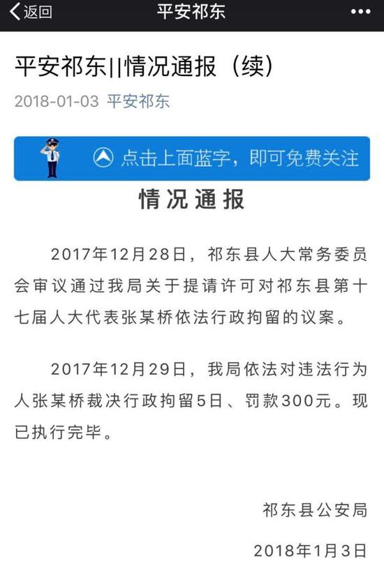 1月3日,祁東縣公安局微信公號“平安祁東”通報:2017年12月28日,祁東縣人大常務委員會審議通過我局關于提請許可對祁東縣第十七屆人大代表張某橋依法行政拘留的議案。 2017年12月29日,我局依法對違法行為人張某橋裁決行政拘留5日、罰款300元。現已執行完畢。