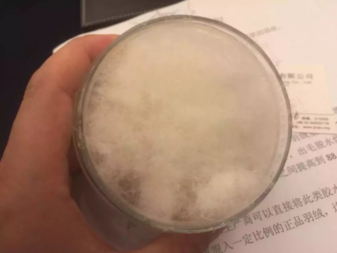 “膠水絨”是一種形象的說法,造假方法是通過膠水粘絨劑將絨絲粘連成朵,然后摻兌到正常的朵絨中,制造高蓬松度的假象,以達到以次充好的目的。與此前摻兌粉碎毛、雞絲絨的造假方式相比,膠水絨更加隱秘。