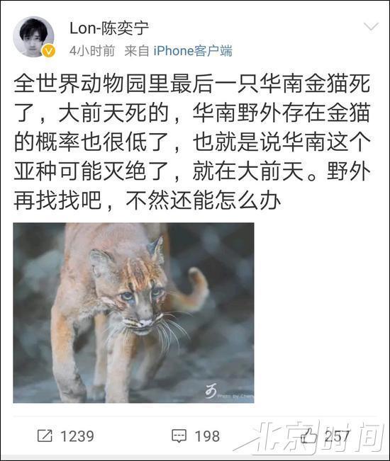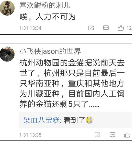 1月31日下午,科普賬號@Lon-陳奕寧發微博稱,“全世界動物園里最后一只華南金貓死了,大前天死的,華南野外存在金貓的概率也很低了,也就是說華南這個亞種可能滅絕了,就在大前天。野外再找找吧,不然還能怎么辦 ”。