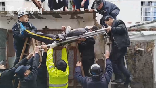 家人說,男子是從三樓跳下來的,幸好摔在了一樓的平臺上,再偏一點點摔到地上就嚴重了。男子被民警和醫務人員合力抬到擔架后,立即送往醫院進行救治。