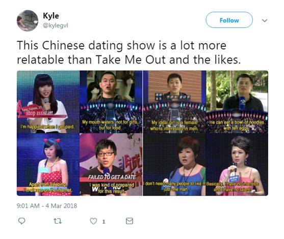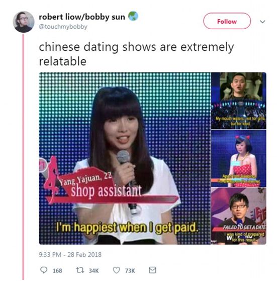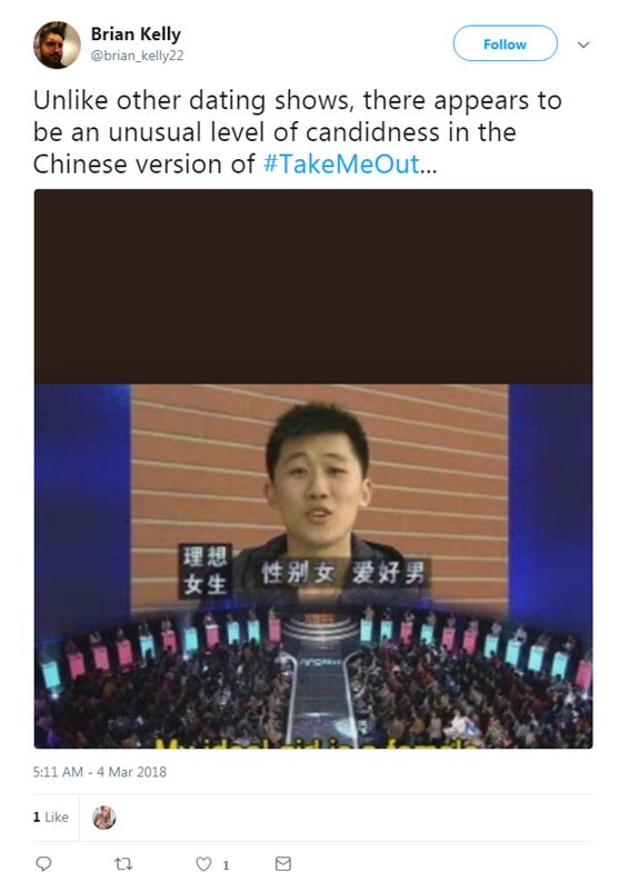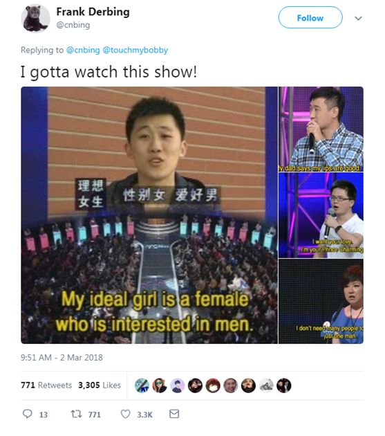 報道稱,把這些截圖搬到推特上的,是一位名叫Bobby Sun的來自倫敦的用戶,他在特的推文里寫道:中國的這檔相親綜藝節目“極其地貼近生活”。