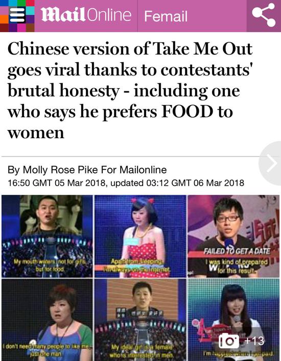 開播已經8年的“大型生活服務類節目”《非誠勿擾》在中國算是真人秀界老資歷了。但是最近,這檔國內的老牌綜藝居然火到了國外。英國《每日郵報》3月5日撰文稱,一檔來自中國的相親綜藝節目由于其“歡樂又不失坦誠的妙語連珠”,正在推特上迅速走紅。
