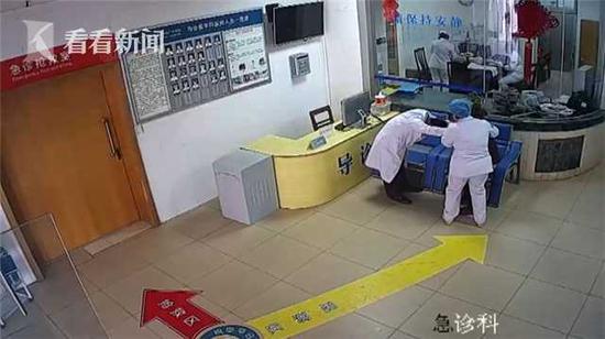 醫院的監控畫面顯示,一位老人在女兒的攙扶下,來到急診科搶救室的休息區坐下。醫生來了之后與老人攀談了幾句,老人突然起身,給醫生鞠躬,醫生連忙鞠躬回謝。