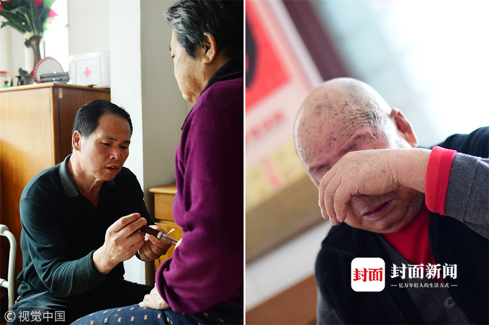 2018年03月19日,山東省青島市。管敬德今年58歲,是山東省青島市北區雙山街道的一位居民。他84歲的老母親被糖尿病折磨了20余年,每天注射胰島素;16年前,他愛人身患重病去世;90歲高齡的父親又患了老年癡呆癥,然而造化弄人,2016年他又患上胃癌,四分之三個胃被切除。從此,他開始一邊抗癌一邊照顧患病的雙親。