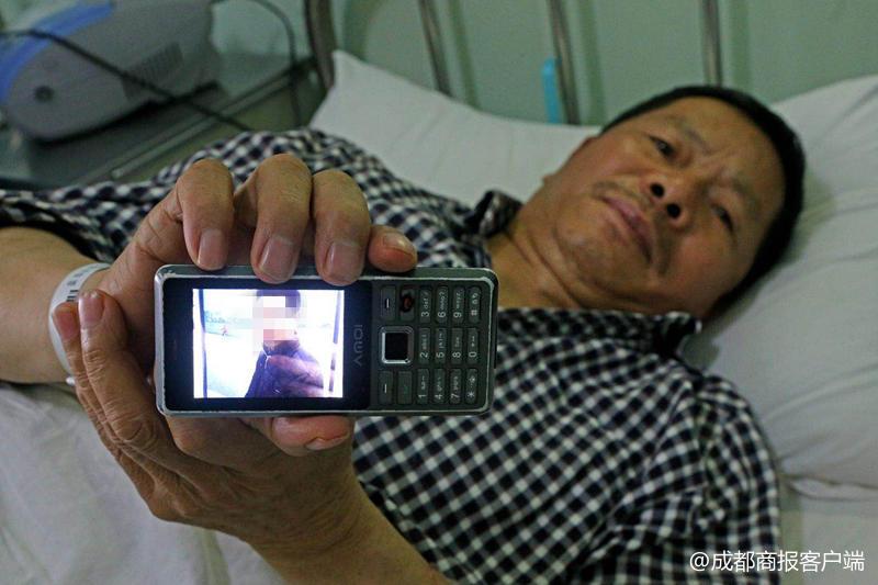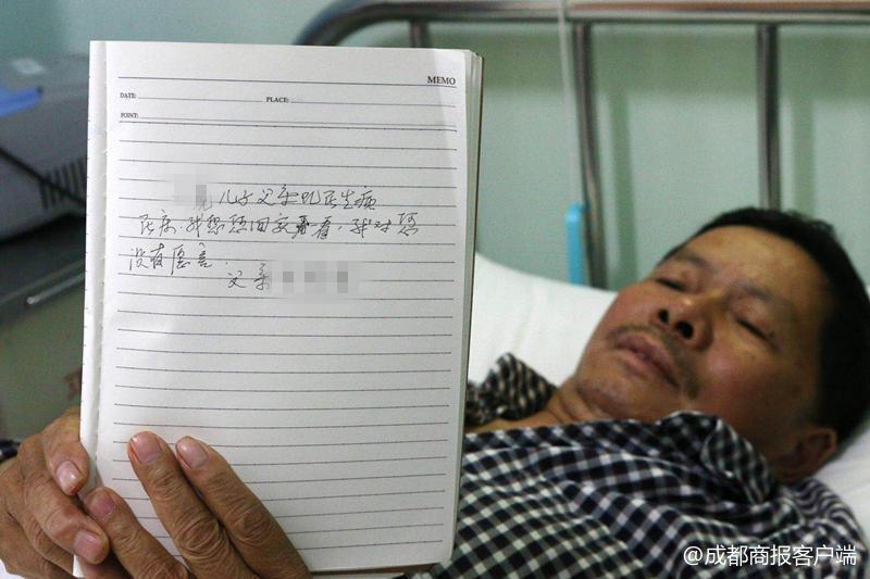 “小虎兒子,父親現(xiàn)在生病在床,我想您回家看一看,我對(duì)你沒(méi)有怨言。父親彭烈金。”邛崍市人民醫(yī)院,63歲的彭烈金從病榻上臥起,紅色的血液在腰部的導(dǎo)管回流,家人讓他趕緊躺下。彭烈金雙手微顫,寫下這段話。