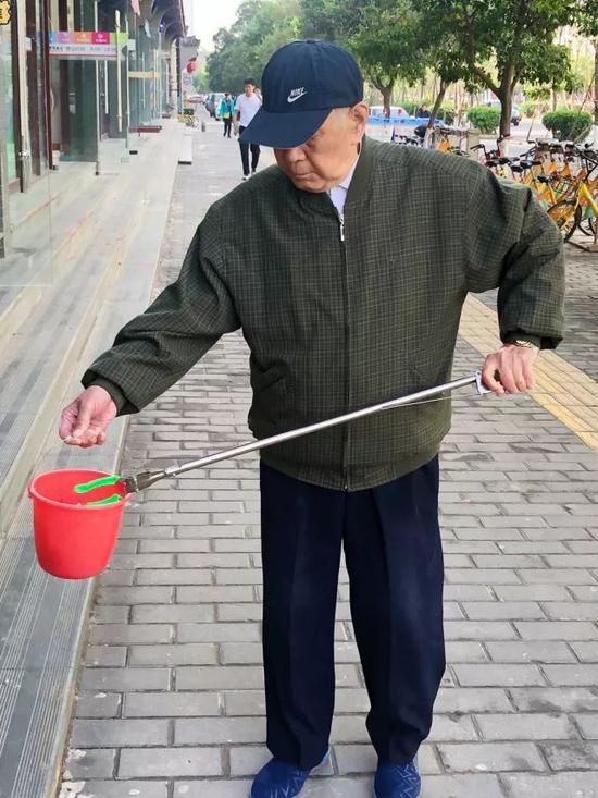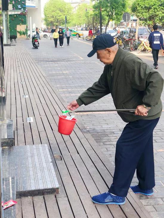 曾老爺子,一手提著紅色塑料桶,一手拿著垃圾夾,不顧頭頂烈日,循著以往路線,目不轉睛地盯著地面,時不時撿起煙頭或垃圾,攢到一定量時,倒進路邊的垃圾桶里。