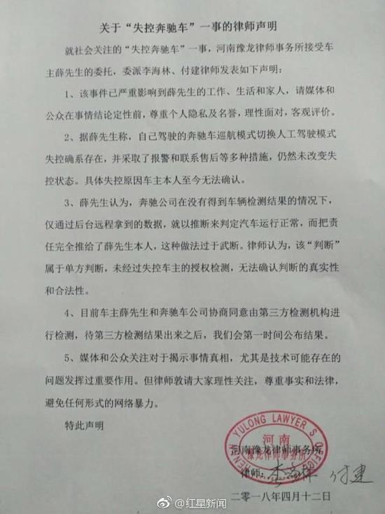 [#失控奔馳#車主薛立山委托律師發表聲明]4月12日,“失控奔馳”車主薛立山委托河南豫龍律師事務所發表聲明。聲明中稱,薛立山駕駛奔馳車時巡航模式切換人工駕駛模式失控確系存在,具體原因至今無法確認。薛認為,奔馳公司在沒有得到車輛檢測結果的情況下,僅通過后臺遠程拿到的數據推斷汽車運行正常,把責任完全推給車主一方過于武斷。律師在聲明中稱,無法確認判斷的真實性和合法性。目前,薛立山和奔馳車公司協商同意由第三方檢測機構進行檢測。4月9日,奔馳公司發給媒體《關于薛先生用車經歷的進一步說明》稱:“目前已有的相關車輛的技術信息,包括遠程獲取的信息,顯示相關系統在事發當晚運行正常,包括報道中提到的定速巡航及制動系統等。”