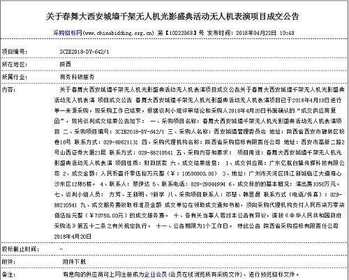 記者通過招標采購網了解到,該項目由西安城墻管理委員會采購,成交供應商為廣東億航白鷺傳媒科技有限公司,成交金額為1050萬人民幣。