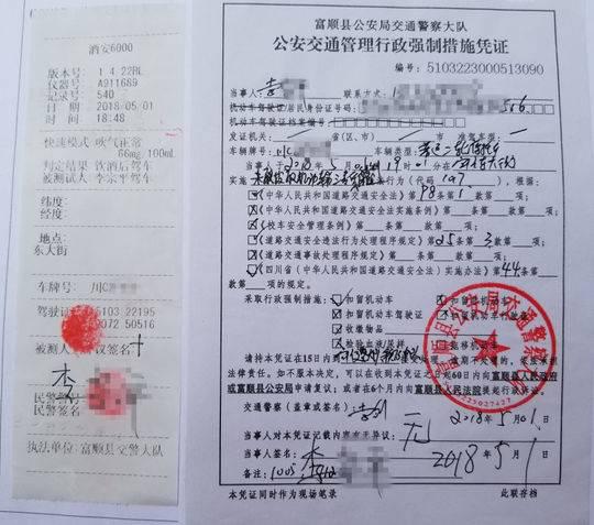 當天,富順縣公安局交警大隊民警帶隊在東街設卡開展路面重點違法行為檢查中,擋獲一輛川C2***9普通二輪摩托車。駕駛人因涉嫌“酒駕”,民警對其進行呼氣式酒精檢測,結果為66mg\100ml,系飲酒后駕駛機動車的違法行為。