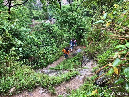 越往上山路就越窄,不能并排走,我們的隊(duì)伍只能拉成一條線,緩慢地向上爬。雨中光禿禿的石塊非常地滑,我們接二連三地摔跟頭,但孩子們告訴記者他們已經(jīng)習(xí)慣了:“不累,因?yàn)樽吡?xí)慣了,今天不算難走。”