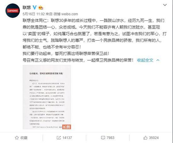 16日上午,聯想發布了一篇措辭激昂的公開信《行動起來,誓死打贏聯想榮譽保衛戰!》。信中稱:
