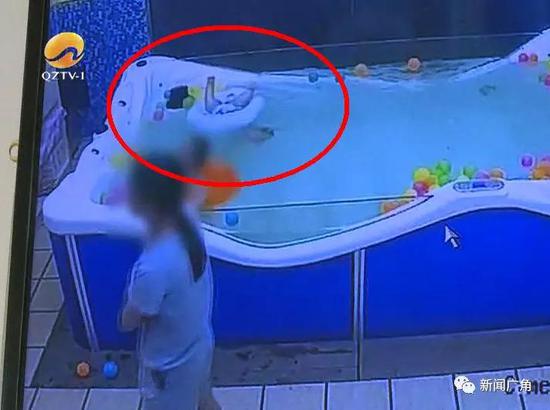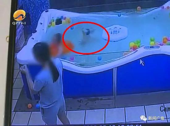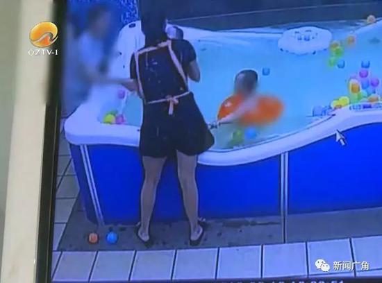 從視頻中可以看到,張女士寶寶落水后,剛開始寶寶的掙扎幅度很大,后來越來越小。直至他移動到橙色游泳圈寶寶旁邊時,一名穿黑衣的工作人員才跑過來將寶寶抱起。整個溺水過程約有46秒。