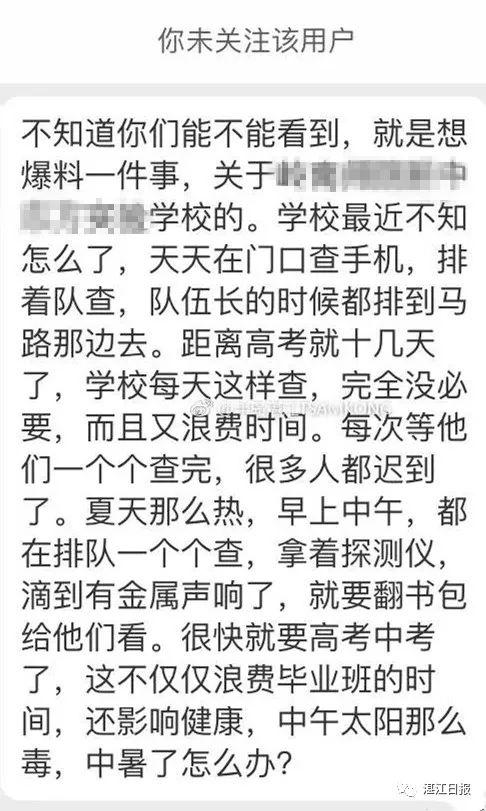 原標(biāo)題:湛江一學(xué)校每天讓學(xué)生排長(zhǎng)隊(duì)搜身查手機(jī)! 學(xué)生吐槽:我早餐里的雞蛋都被捏爆了