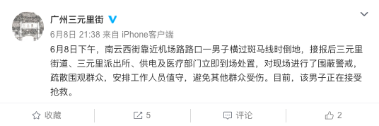 6月8日下午,南云西街靠近機場路路口一男子橫過斑馬線時倒地,接報后三元里街道、三元里派出所、供電及醫療部門立即到場處置,對現場進行了圍蔽警戒,疏散圍觀群眾,安排工作人員值守,避免其他群眾受傷。