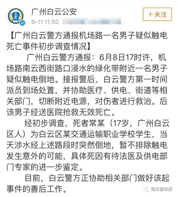 廣州白云警方今早11:50發布通報:暫不排除觸電發生意外的可能,具體死因有待法醫及供電部門專家的進一步鑒定。