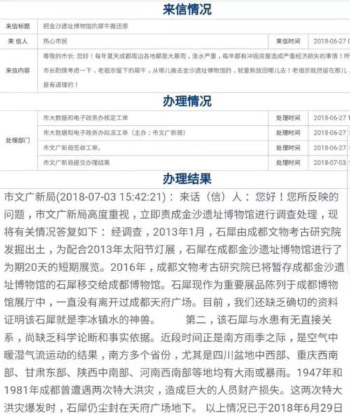 1、網上盛傳的關于石犀的來信辦理截圖屬實,系成都市文化廣電新聞出版局通過成都市人民政府門戶網站的市長信箱正常回復熱心市民的內容。