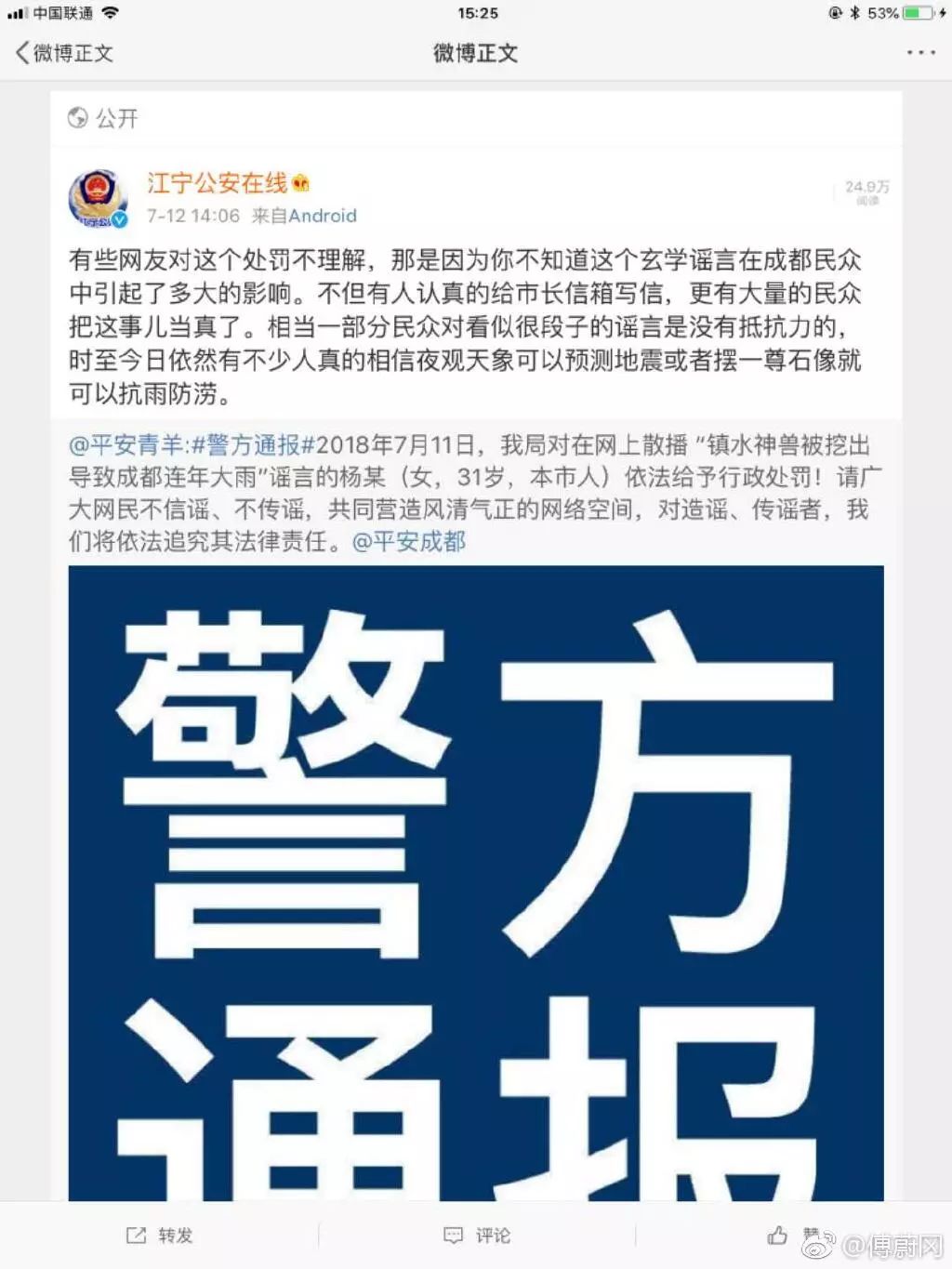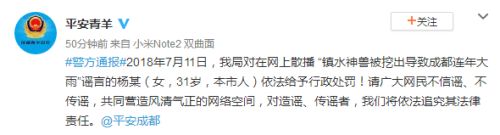 2018年7月11日,@平安青羊發布警方通報,對在網上散播“鎮水神獸被挖出導致成都連年大雨”謠言的楊某(女,31歲,本市人)依法給予行政處罰。