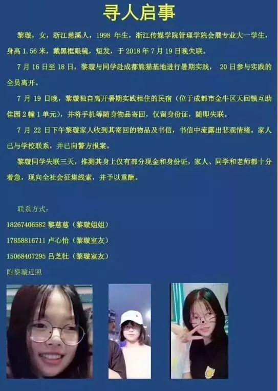 19日晚,黎璇同學(xué)獨(dú)自離開(kāi)位于成都市金牛區(qū)天回鎮(zhèn)互助佳園2幢1單元,暑期實(shí)踐同學(xué)們所住的民宿;并將手機(jī)等隨身物品和一封書(shū)信寄回自己家中,留下了身份證,隨即失聯(lián)。