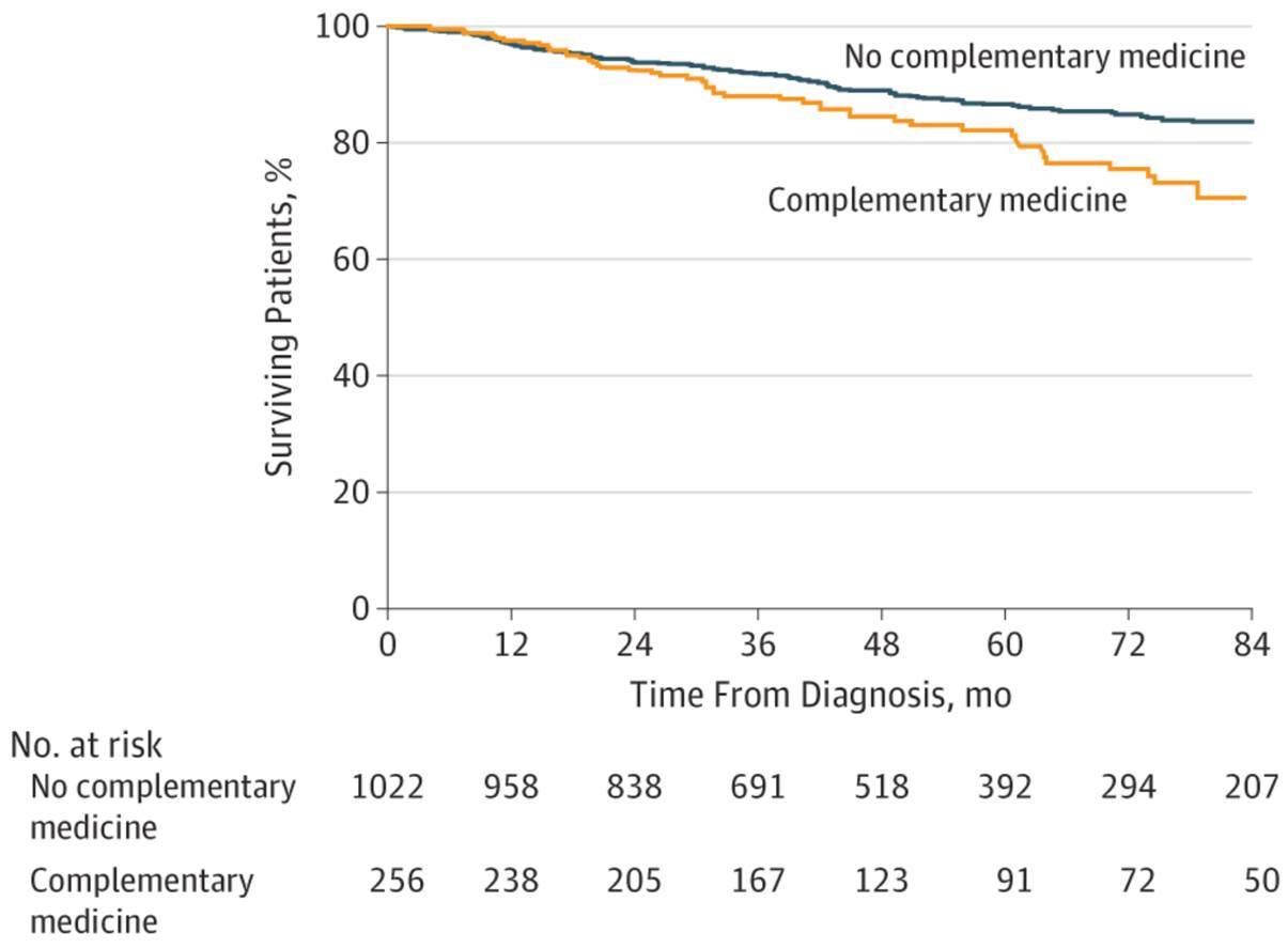 使用過補充醫學療法的患者(黃線)生存率顯著下降。