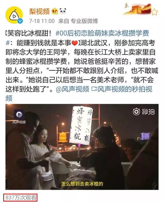 (圖:武漢晚報)此前,@梨視頻 的一條關于#00后初戀臉萌妹賣冰棍攢學費#的新聞引發熱議,視頻播放量超過800萬,話題閱讀量超過3000萬↓↓↓