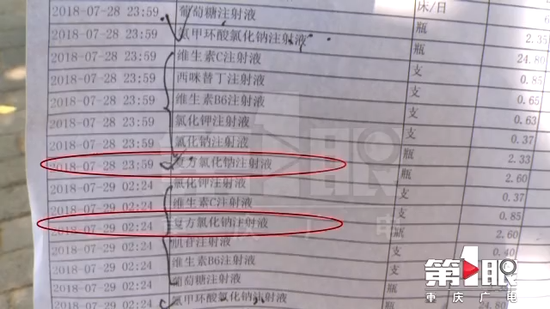 包裝上明確標(biāo)明,生產(chǎn)日期是2016年6月21日,有效期至2018年5月。從費(fèi)用明細(xì)上可以看到,楊大爺分別于28日23點(diǎn)59分和29日凌晨2點(diǎn)24分,在沙魚鎮(zhèn)衛(wèi)生院,兩次使用了這種復(fù)方氯化鈉注射液。隨后,朱先生返回衛(wèi)生院,在垃圾桶里找到了一瓶復(fù)方氯化鈉注射液,瓶身上的信息表明,這就是楊大爺注射過的藥瓶,而這一瓶,有效期同樣是2018年5月。