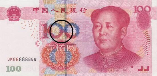 這只鳳鳥來源于戰國時期的漆器圖案,若隱若現地印在鈔票正面“100”字樣的背景中,大概是這個位置: