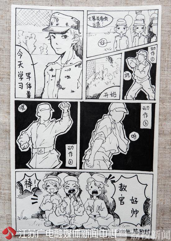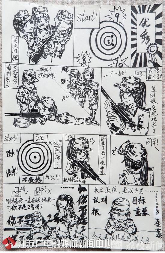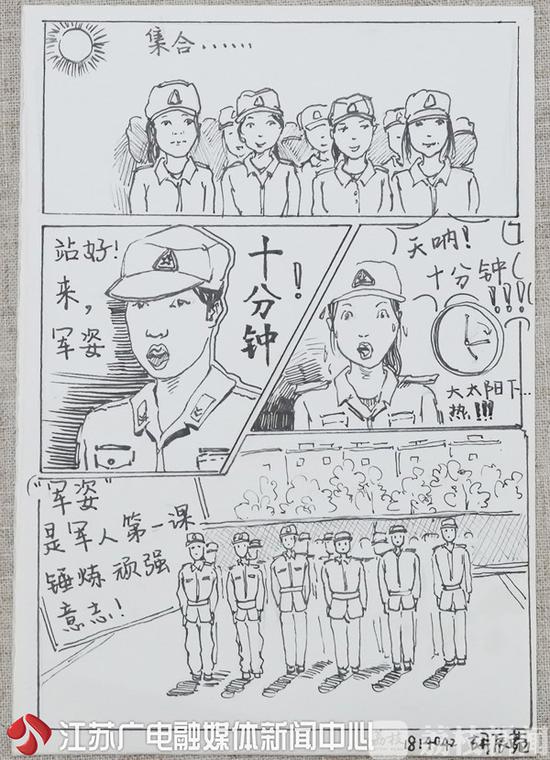 “還記得那次射擊課,自以為很帥地瞄準(zhǔn)了靶子,結(jié)果一發(fā)未中,原來(lái)是瞄錯(cuò)了隔壁同學(xué)的靶!”想到這段囧囧的經(jīng)歷,秦蓁就有點(diǎn)忍俊不禁,她把這段小插曲畫成了漫畫,還加上了內(nèi)心OS;而胡辰菀則把大伙兒最“頭疼”的站軍姿,畫了出來(lái),她回憶:“雖然在大太陽(yáng)底下很熱,但這是軍人錘煉頑強(qiáng)意志的第一課。”