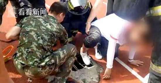 女生腿被"卡"在操場(chǎng)上 消防拆塑膠跑道鑿水泥救人