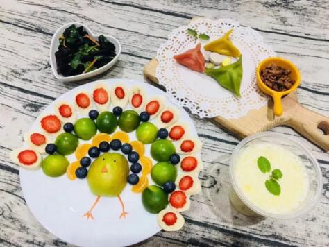 每天的早餐,葉媽媽也會(huì)擺成各種造型。“也不是僅僅為了好看,女兒不喜歡吃藍(lán)莓,我就把各種水果擺一只蜻蜓,用藍(lán)莓當(dāng)眼睛。她一看,第一口就把藍(lán)莓吃掉了。有一次我們鄰居有事,把孩子放我們家,小朋友每天吃早餐都不肯回去了。”