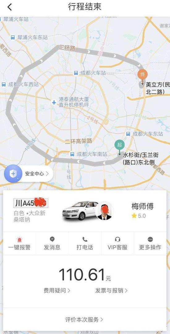 訂單最終扣費110.61元,訂單還顯示這位滴滴師傅姓梅,評級為5.0,是一輛川A牌照的車輛。