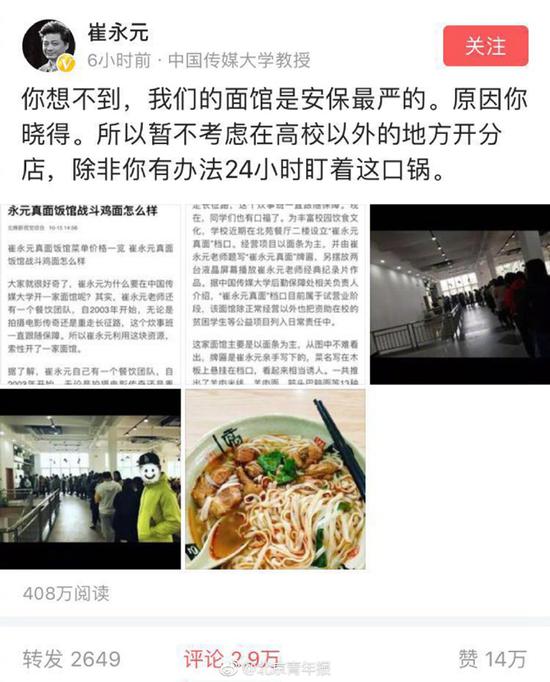 [@崔永元 就“崔永元真面”發文回應:不考慮在校外開分店]近日,中國傳媒大學的北苑餐廳開了一家名叫“崔永元真面”的餐飲檔口,已經成了校園里的網紅飯館。北京青年報記者從中國傳媒大學后勤保障處獲悉,“崔永元真面”由崔永元餐飲團隊經營,牌匾由崔永元老師親自題寫,另擺放兩臺液晶屏幕播放崔永元老師經典紀錄片作品。據了解,該檔口以面食為主,有羊肉米線、羊肉面、筋頭巴腦面等13種面食,價格從10元到18元不等。目前,“崔永元真面”檔口目前屬于試營業階段,該面館除正常經營以外,也把資助在校的貧困學生等公益項目列入日常責任中。崔永元對于面食質量非??粗?,并發文回應稱:你想不到,我們的面館是安保最嚴的。原因你曉得。所以暫不考慮在高校以外的地方開分店,除非你有辦法24小時盯著這口鍋。(北青報記者 劉婧)