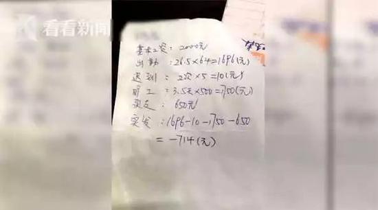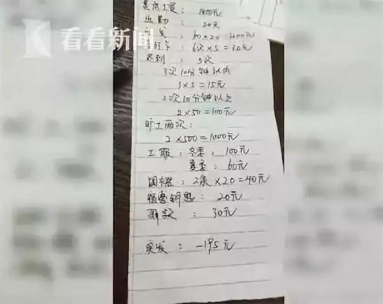 昨日,華商報記者看到了小雪提供的工資條,顯示小雪的工資每天為60元,出勤20天共1200元,因為遲到忘打卡共扣除145元,工服、圍裙、鑰匙等共扣除250元,曠工兩天每天扣500元,最終實發為負195元。小雪說,在開始工作時,老板并沒有說過曠工每天要扣500元。